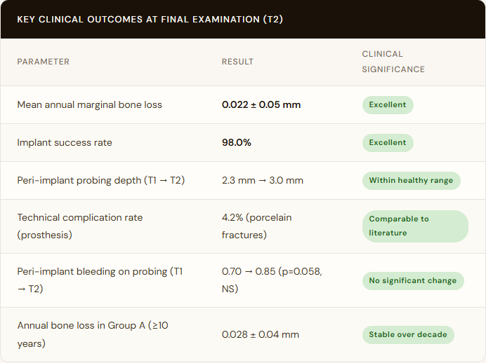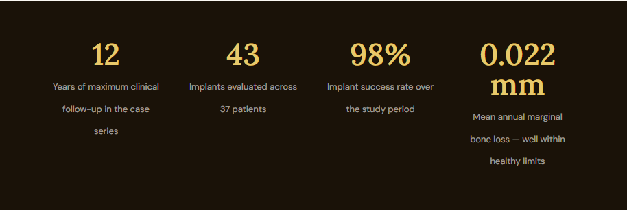 It bears stating plainly: this is not a system that asks clinicians to trade outcomes for convenience. The marginal bone loss data across 12 years of follow-up is better than what many conventional single-crown implant studies report. The peri-implant tissue parameters at final examination reflect health, not compromise. And the biomechanical modeling confirms that the forces reaching the bone are within ranges that bone tissue handles well.
